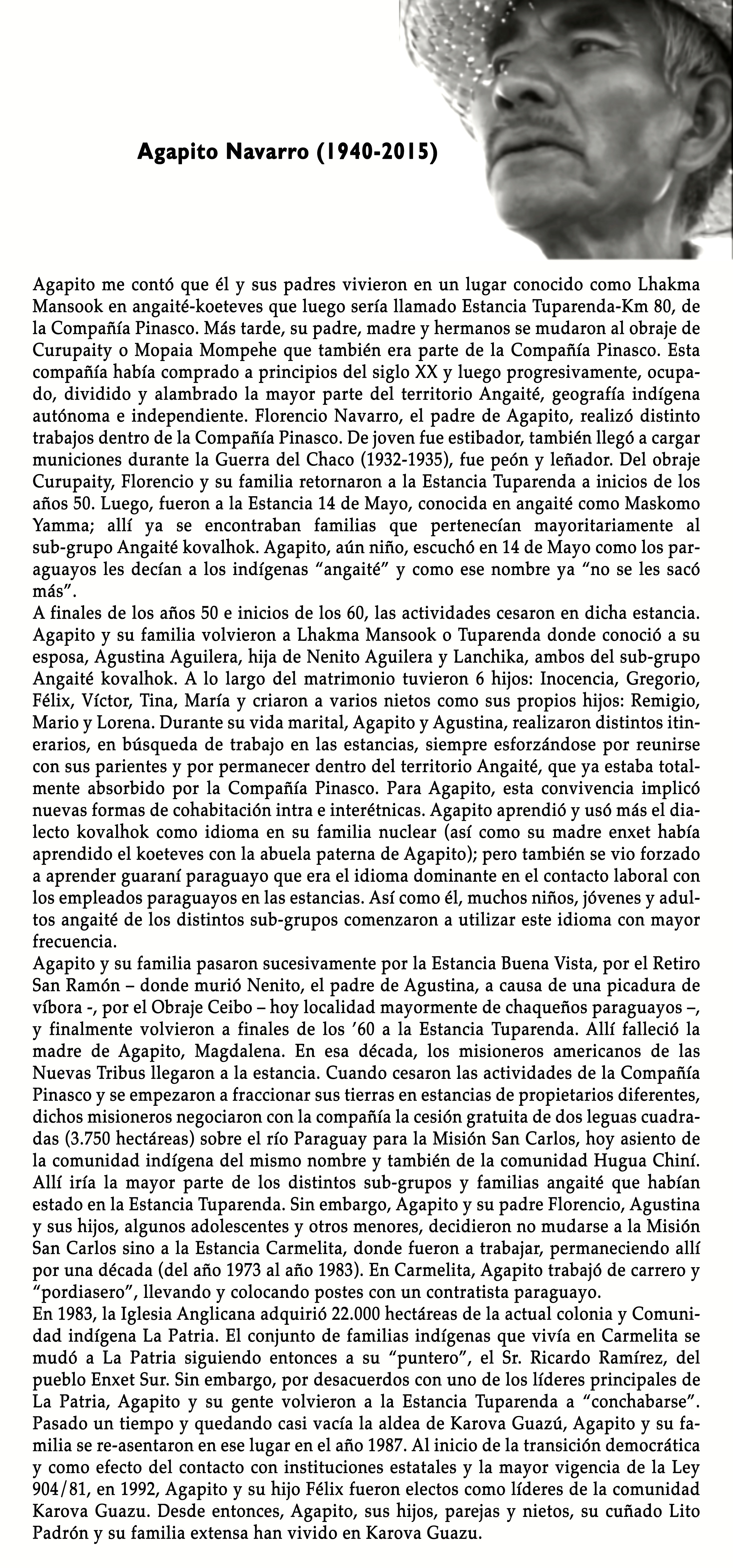 El 14 de diciembre en el Hospital Max Boettner falleció Agapito Navarro, líder y chamán del Pueblo Angaité. Tenía 75 años y una tuberculosis que fue complicando su salud. Agapito era hijo de Florencio Navarro y nieto de Pablito Yryndey pertenecientes al sub-grupo Angaité koeteves. También, era hijo de Magdalena Pablito y nieto de Paulino Cabañas, ambos, del pueblo Enxet Sur. Fue un luchador, un gran referente y una persona muy querida por quienes conformamos el equipo de trabajo de Tierraviva. Agapito Navarro era líder de la comunidad Karova Guazu, de La Patria ubicada en el Departamento de Presidente Hayes.