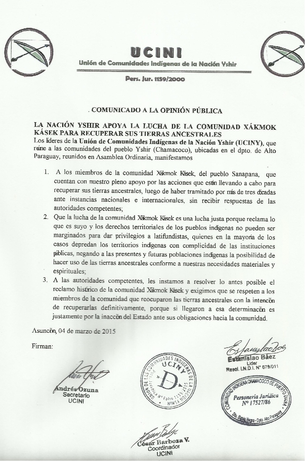 5.  Exigimos la desestimación de la denuncia presentada por la Ministra de la Corte Suprema de Justicia, Gladys Bareiro de Módica, contra la Abogada Julia Cabello y asimismo al Estado paraguayo la restitución legal de sus tierras a la comunidad enxet de Sawhoyamaxa.
