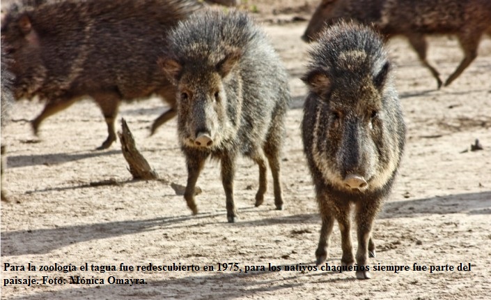 Pero si nuestro monte imaginario de 246 mil kilómetros cuadrados (la extensión actual de la planicie chaqueña) es un jolgorio de algarrobos y abejas meleras, las raíces y hojas de la vegetación que entonces aprovechaba el tagua eran incalculables. Estos chanchos silvestres herbívoros de prominentes cabezas, de años prehistóricos, de pelaje duro y erizado gozaban de una abundancia infinita de alimentos. Solo debían tomar, con sus fuertes hocicos, las raíces y las hojas de los arbustos y las plantas. A veces, las manadas de taguas se encontraban fortuitamente con manadas de tapires (el imponente y temible mborevi). El conflicto se resolvía a favor del segundo, con la estampida de los chanchos silvestres en cantidad inimaginable.