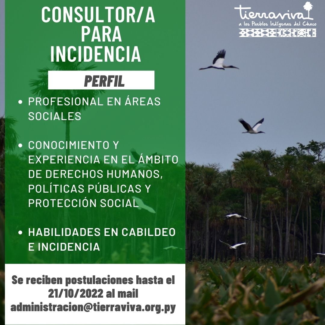 Tierraviva busca incorporar a un/a Consultor/a para Incidencia. Para postular accede a los términos de referencia en el siguiente link TDR Consultoría para Incidencia