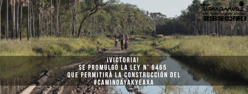 Con una profunda alegría y emoción recibimos la notícia de la promulgación de la Ley de Expropiación para la construcción del camino que permitirá a la Comunidad Enxet Yakye Axa ingresar, tras más de 20 años de lucha, a sus tierras. Esta noticia llega en el Día Internacional de los Derechos Humanos, convirtiéndose en un importante aliciente y un respaldo enorme a la sacrificada lucha de cientos de líderes, lideresas y comunidades indígenas que día tras día luchan en defensa de su territorio y de sus derechos fundamentales.
