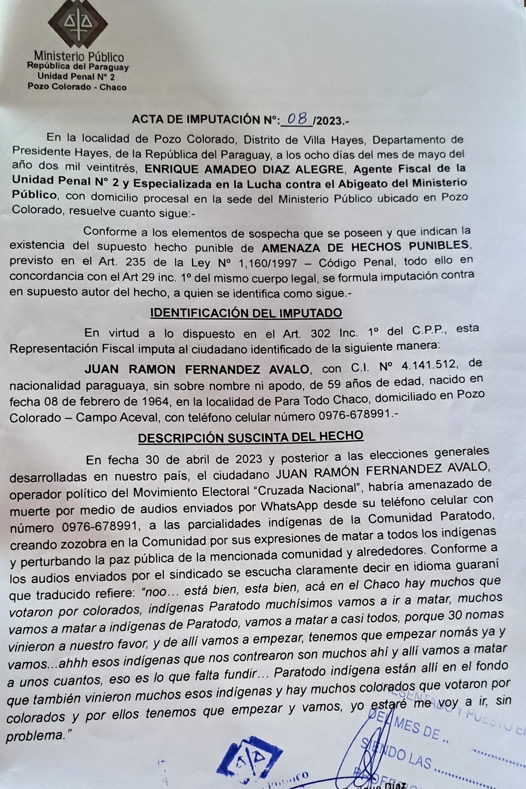 “Solicitamos el rechazo de ese proyecto de ley por razón de que el Parque Nacional Médanos del Chaco forma parte del territorio ancestral del pueblo Guarani Ñandeva y del pueblo Ayoreo” menciona la nota que añade que en las tierras que serán afectadas por la explotación viven especialmente “hermanos Ayoreo en aislamiento voluntario”.